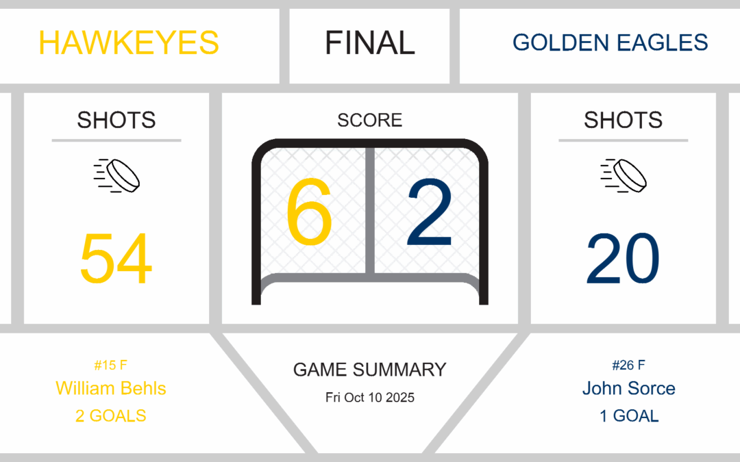 Despite the Golden Eagles’ 20 shots on goal, they were unable to surpass the Hawkeyes’ defense and goalie, Riley Stirrett. Stirrett put on a commanding performance with 18 saves on 20 shots. On the other side of the rink, Golden Eagles’ goalie, Daniel Ledger, faced a barrage of 54 shots, managing to save 48.